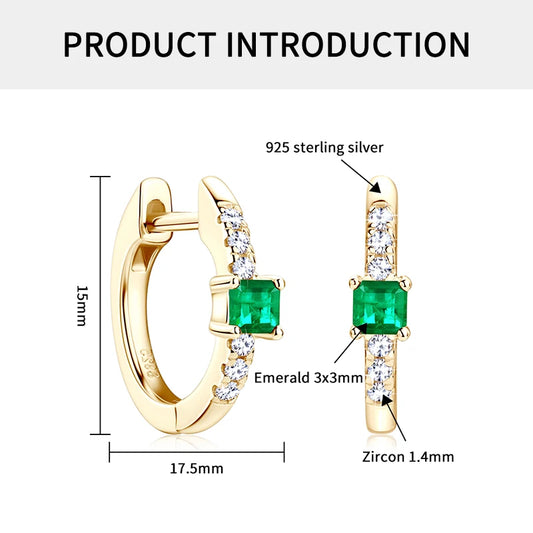925 Sterling Silver Plated 14K Gold Ladies Hoop Earring 3x3mm Square Artificial Emerald Vintage Earrings for Women Jewelry Gift