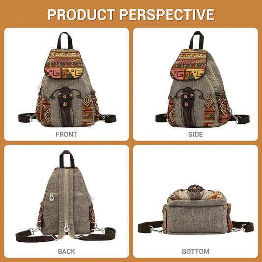 MOTAORA Handmade Women's Bohemian Backpack Vintage Canvas Mini Rucksack Ethnic Geometric Print Travel Casual Daypack Lightweight