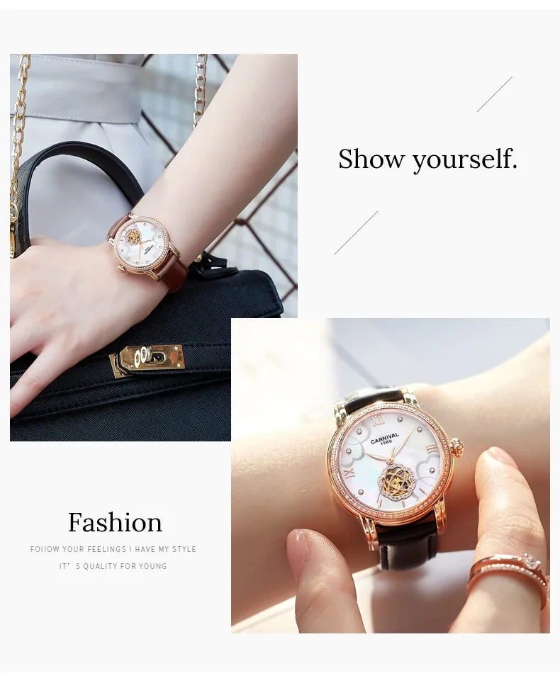 CARNIVAL Fashion Tourbillon Watches for Woman Luxury Diamond Automatic Watch Waterproof Leather Sapphire Mechanical Wristwatches