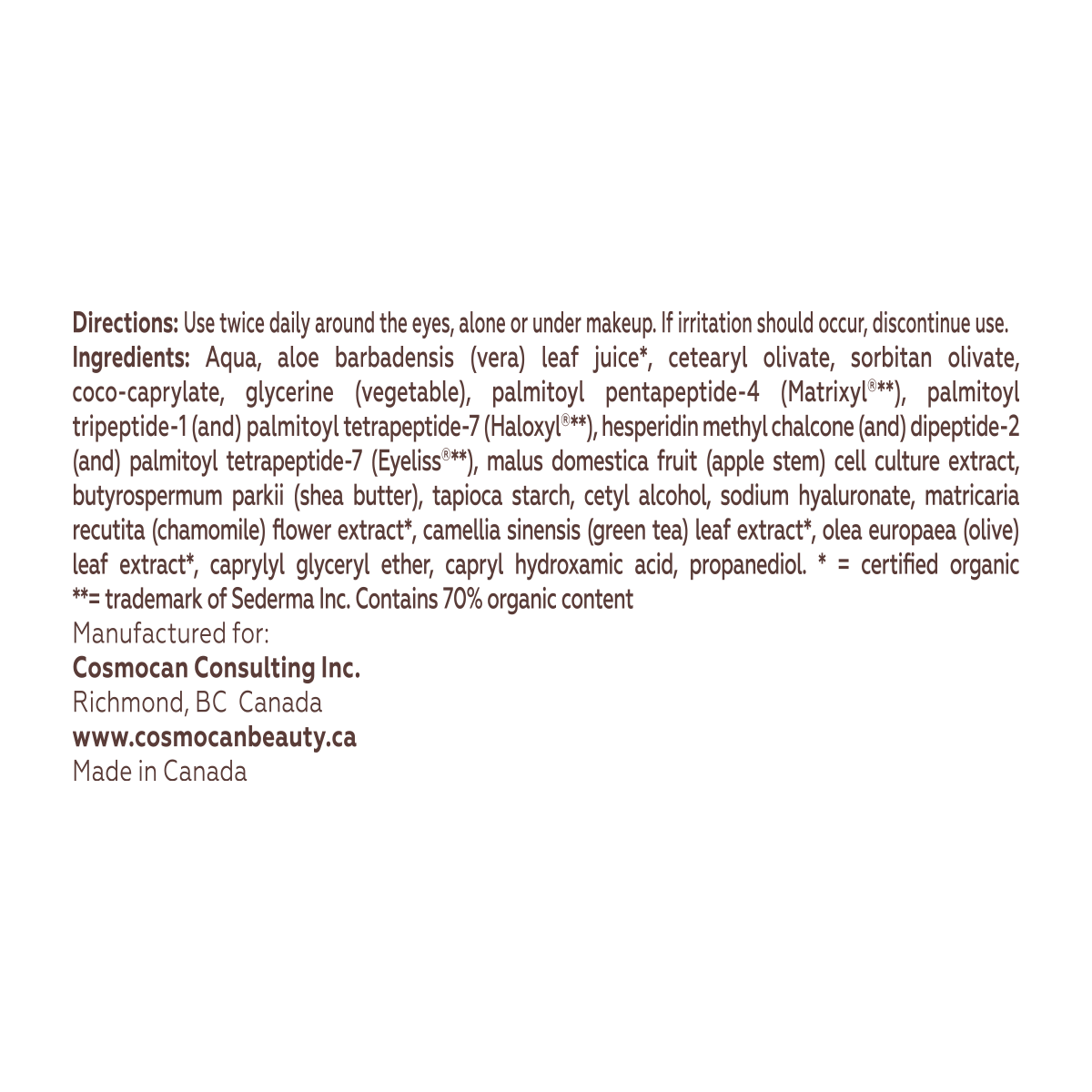 Use twice daily around the eyes, alone or under makeup. If irritation should occur, discontinue use.